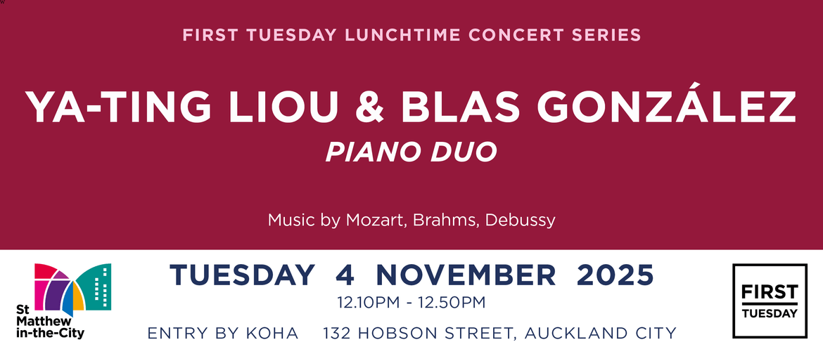Summary: Our November First Tuesday concert is on 4 November at 12.10pm, and features the piano duo Ya-Ting Liou & Blas González. Music by Mozart, Brahms, Debussy. Entry by koha.see more